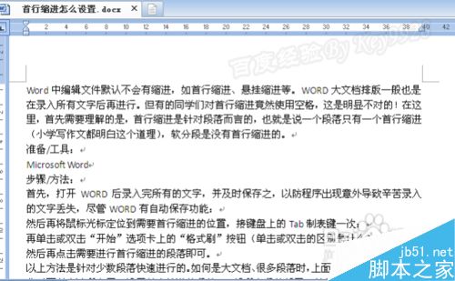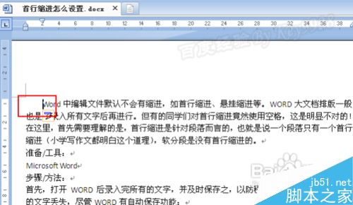 然后再将鼠标光标定位到需要首行缩进的位置,接键盘上的Tab制表键一次: