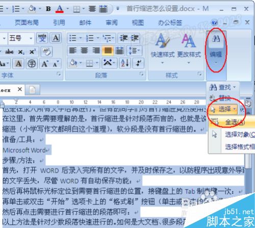 此时可以全选所有需要设置首先缩进的段落,一般所有段落都需要首行缩进的,所以可以按CTRL+A键全选: