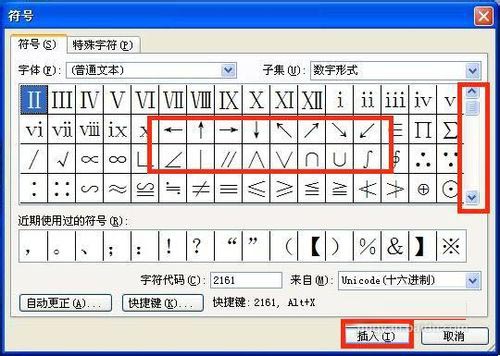 3、点击符号以后出现符号窗口,然后在符号窗口上面点击符号,然后再通过点击滑动右边的光标找到箭头符号,点击要插入的符号然后点击插入按钮即可