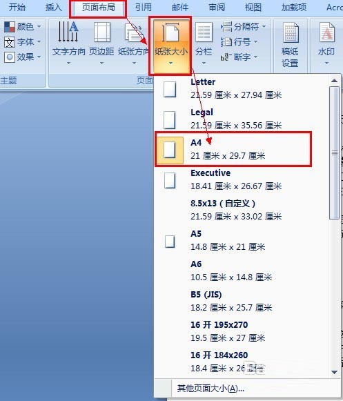 4、依次单击"页面布局,纸张大小,A4",将电子板报设定为A4大小: