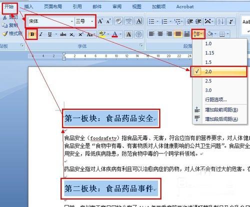 6、选中文字的标题部分(可以按Ctrl键同时单击或者拖拽,选取不同位置的文字),然后单击"开始",设置文字的大小,字体,和黑体等,然后选择行间距为2.0: