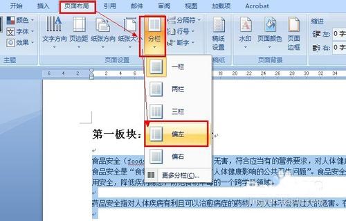 8、选择要分栏的文字,然后依次单击"页面布局,分栏,偏左: