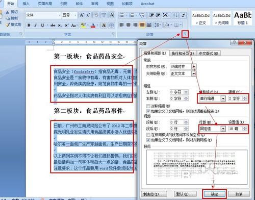 7、选中正文部分,然后单击段落栏的右下角图标,设置首行缩进2字符,和固定值为18磅后,单击"确定":