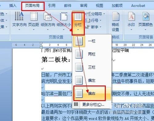 9、将另一部分正文选择"页面布局,分栏,偏右"进行分栏: