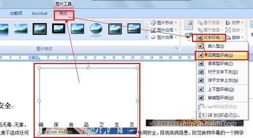 11、选择其中一个图片,然后单击"格式,文字环绕,四周型环绕"。同样的方法设置另一张图片: