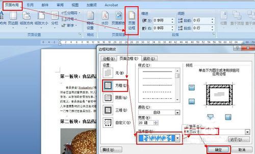 13、依次单击"页面布局,页面边框",然后选择"方框",选择合适的艺术型后,单击"确定":
