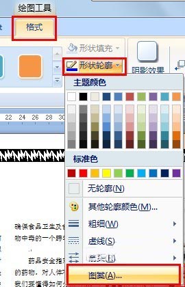 16、继续选择线条,依次单击"格式,形状轮廓,图案":