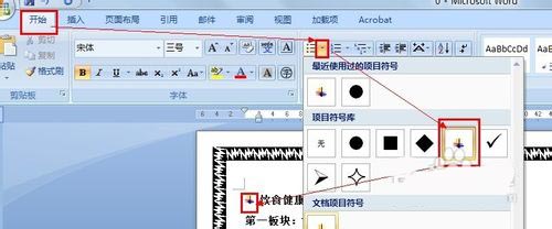 18、在文章的大标题前增加项目符号。依次单击"开始,项目符号",然后选择喜欢的单击:
