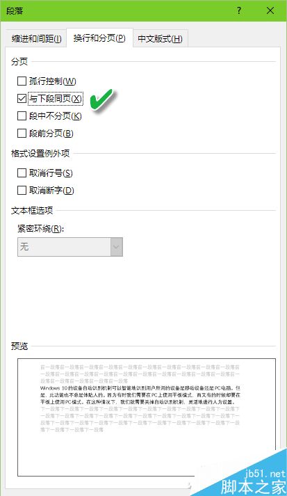 在出现的段落对话框中,单击"换行和分页"标签,选中"与下段同页"复选框,然后单击"确定"按钮。