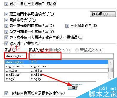 2、在自动更正选项面板中,看到替换这个属性栏,我们在这个属性栏的左边输入标点符号的名字的拼音,在右边输入标点符号。然后点击添加按钮。如果你还是有点迷糊,就看下面的一步。