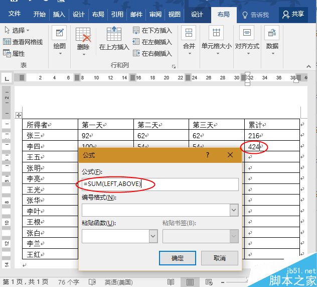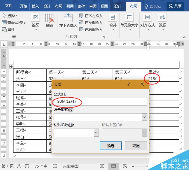我们以下表为例,如果要对"张三"3天的数据进行汇总,只需在其累计单元格中,通过"布局"选项卡下的公式按钮启动公式框,输入"=SUM(LEFT)",确定即可计算出左侧数据之和。