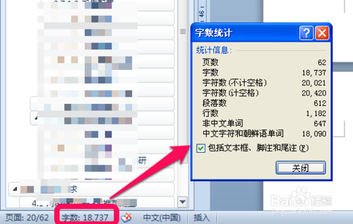 就会弹出字数统计的小窗口,如图,同时,下方有个小勾选项,是指计算文本框、脚注、尾注的,你可以自行选择。