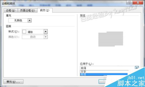 7、在弹出的"边框和底纹"对话框中,切换到"底纹"选项卡。将"填充"改为"无颜色",将"图案"也改成"清除",再将右下角的"应用于"改为"段落",这点务必注意: