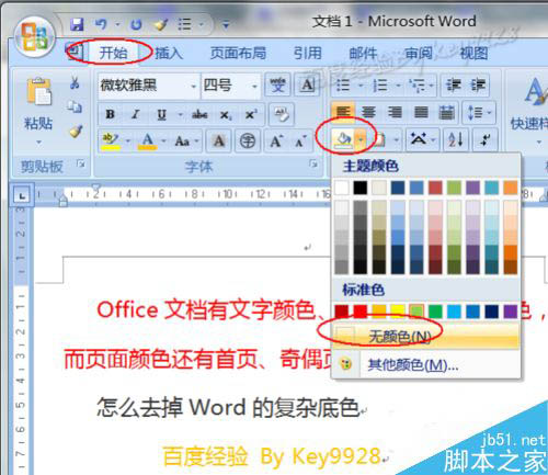 10、再单击"开始"选项卡下的"底纹",从弹出面板中选择"无颜色":