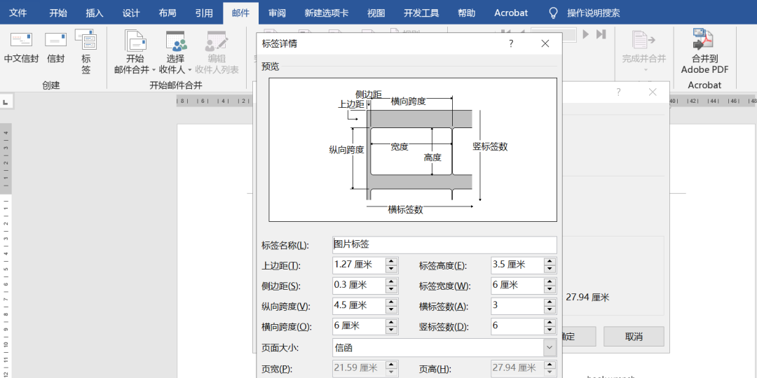 第一步:打开Word文档,点击邮件——开始邮件合并——标签,在打开的界面中,点击新建标签,然后根据需要设置好相应的参数,这里的参数如下图所示: