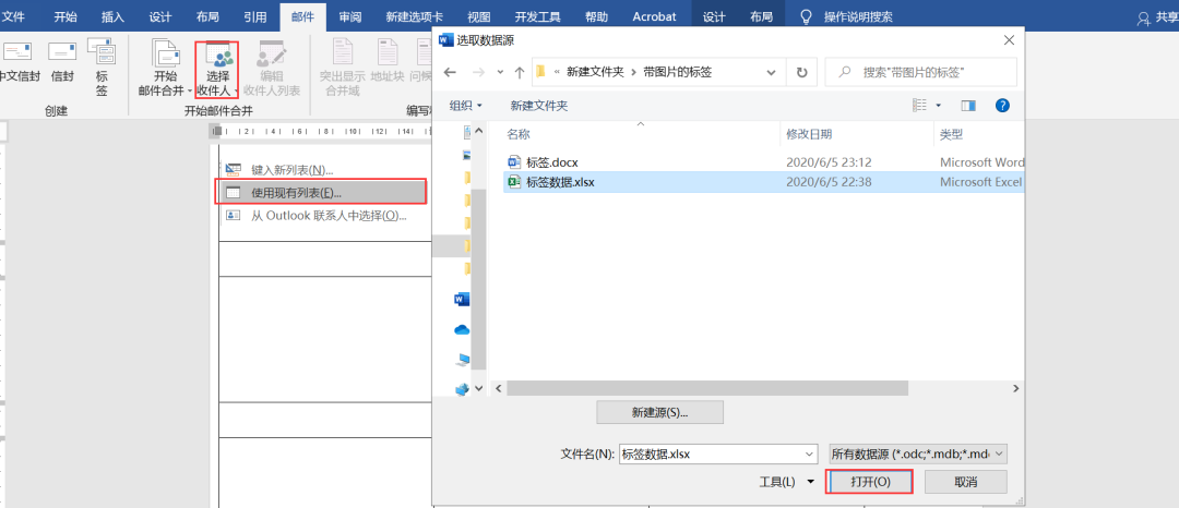第二步:点击选择收件人——使用现有列表,打开Excel表格。