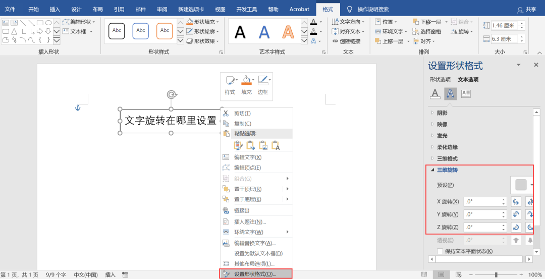 PS:如果想自行设置文字的三维,可以选中文本框右击选择【设置形状格式】 ,之后在三维旋转选项中设置参数。