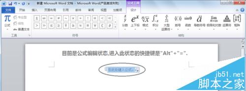 3、可以看到,当点击了"公式"后,进入到了公式编辑的状态。(使用"Alt"+"="快捷键可直接进入此界面)