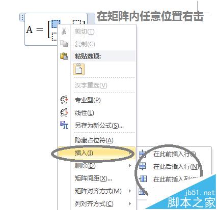 5、但是需要插入的是4×5的矩阵。这时只需要右击矩阵内任意黑色虚线方框,在弹出的菜单的"插入"下级菜单中,选择任意"插入行"2次,任意"插入列"3次。