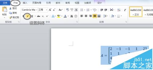 8、当矩阵中存在字母的时候,可以选中整个公式,在"开始"选项卡下的"字体"菜单里选择加粗。