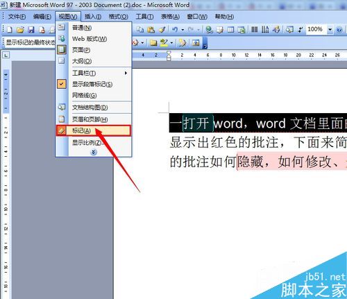 2、打开文档-》点击"视图"按钮-》选择"标记",word文档里的"批注"就被隐藏了。