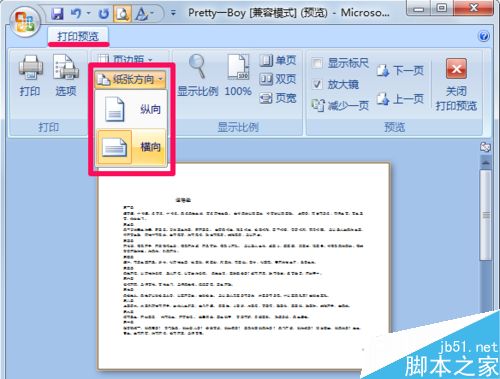 2、在打印预览中点击纸张方向-横向,然后就可以横向打印了。