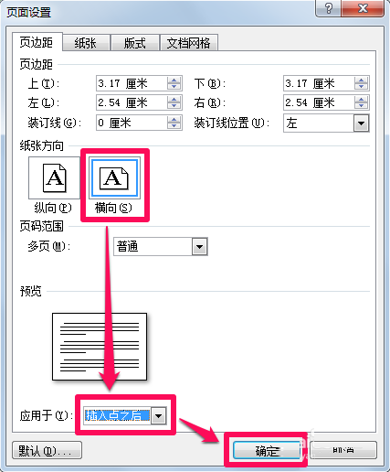 2、在页面设置中把纸张方向设置成横向,然后在应用于中选择插入点之后。