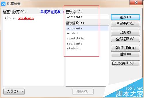 3、然后会出现对话框,这里有更正建议,根据建议提示我们选择正确的拼写方法,接着点击更改。
