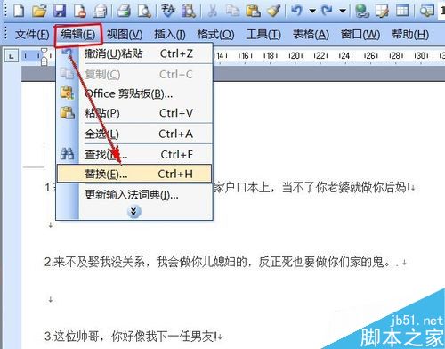 2、在菜单栏里单击"编辑",在下拉菜单中选择"替换"