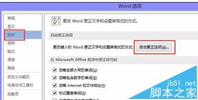4、打开"文件选项卡"——"WORD选项",找到"校对"——自动更正选项。