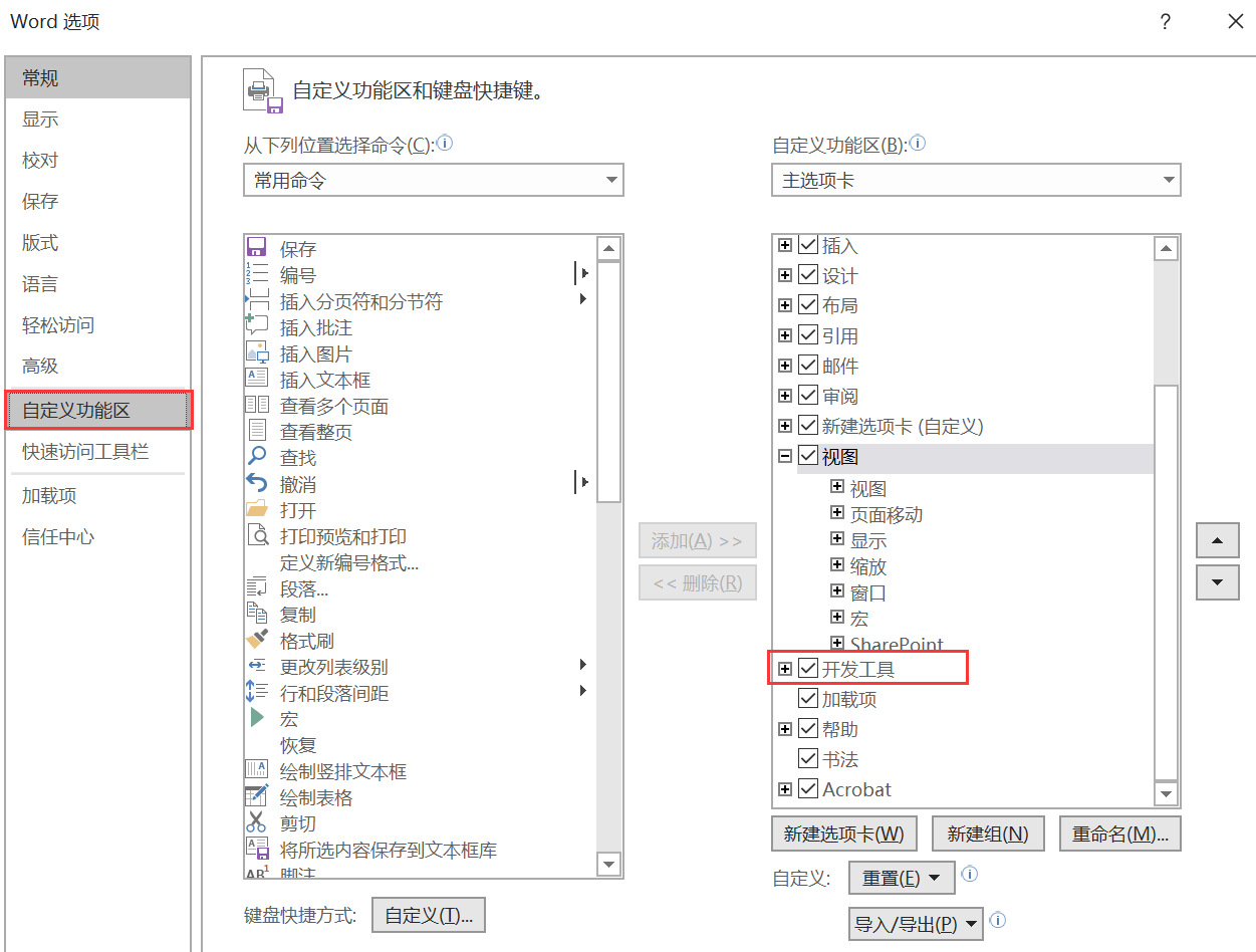 2、 如果选项卡中没有开发工具,可以在自定义功能选项中找到,如下图所示: