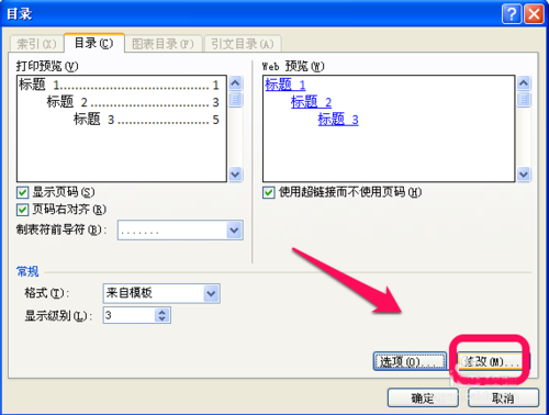 2、插入目录的设置弹出框后,点击右下角的修改,如图。