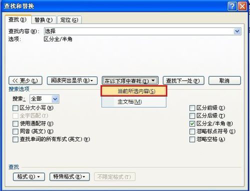 在查找内容后面的文本框里输入要查找的内容,然后在搜索选项里选择"全部",然后在"在以下项中查找"下拉菜单里选择"主文档":