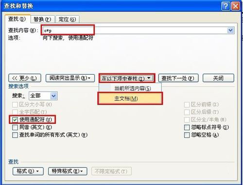 在查找内容中输入o*p,然后勾选"使用通配符"后,在"在以下项中查找"下拉列表中选择"主文档":