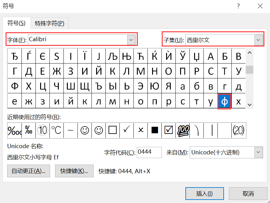 同样是借用符号,点击插入——符号——其他符号,在打开的界面中将字体设置为“Calibri”,子集则设置为“西里尔文”,找到Ф,点击插入即可。