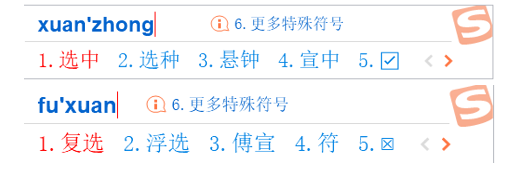 输入拼音“xuanzhong”或“fuxuan”即可获取相应的符号。