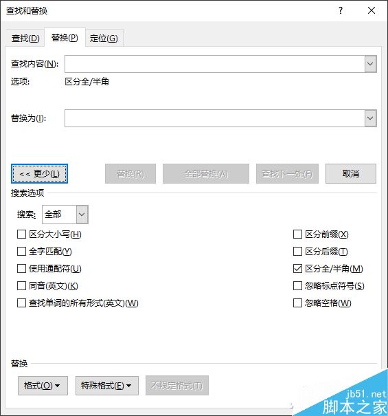 第1步:在Word 2016打开上述的《红楼梦》文档,然后按Ctrl+H键调出"查找与替换"对话框,点击下方"更多"按钮将窗口展开。