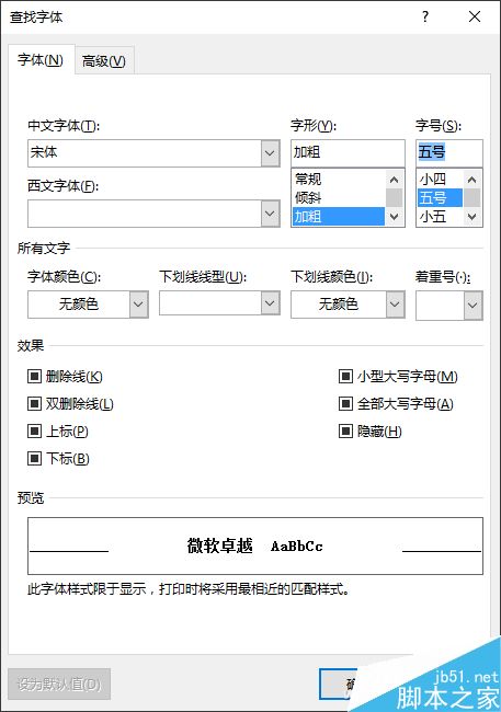 第2步:先将光标置入"查找内容"文本框中,然后点击下方的"格式",从弹出列表中点击"字体"。在打开的查找字体窗口,选择需要查找的字体,比如本例要查找的是中文字体宋体,字形为加粗,字号是五号。设置好后点击"确定"返回。