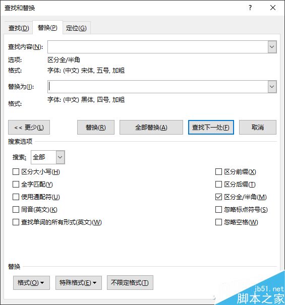 第4步:接下来将光标置入"替换为"文本框中,同上点击"字体",然后设置想要的字体。本例为了让回目更突出,选择替换为黑体,四号字。此时在替换对话框中,将显示原格式和要替换的格式信息。点击"全部替换"即可将所有五号加粗的宋体格式,替换成四号加粗的黑体格式啦。