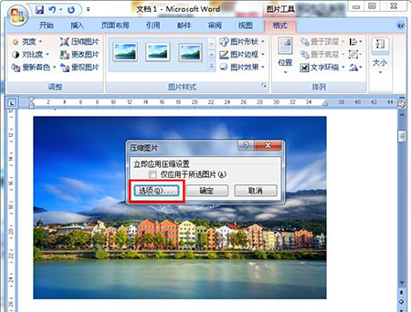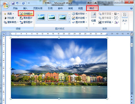 1.打开Word文档,选中需要压缩的图片,接着点击工具栏的"格式"→"压缩图片"。
