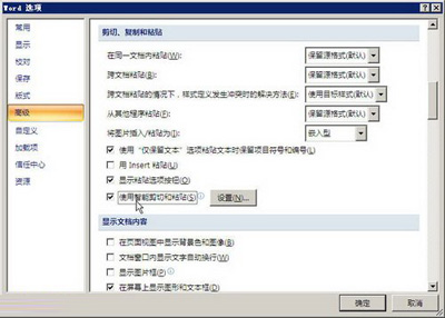 第2步,打开"Word选项"对话框,切换到"高级"选项卡。在"剪切、复制和粘贴"区域选中"使用智能剪切和粘贴"复选框,并单击"设置"按钮,如图2所示。