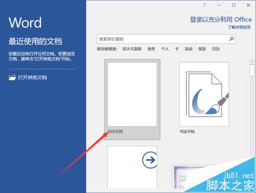 1、鼠标左键双击计算机桌面Word2016程序图标,将其打开运行。在打开的Word2016程序窗口,点击"空白文档"选项,新建一个空白Word文档。如图所示;