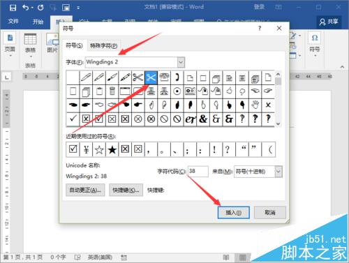 6、在打开的符号对话窗口中,字体选择Wingdings,在这里面可以看到"剪刀"符号的。选择它,然后再点击"插入"按钮。如图所示;