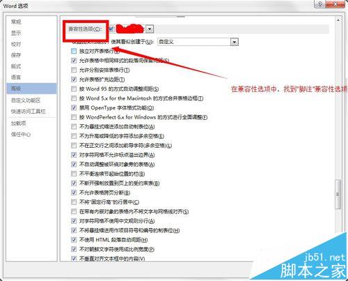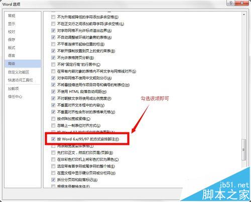 4、在选中"高级"选项后,在右侧找到"兼容性选项"。在其子内容中找到"按word 6.x/95/97的方式安排脚注",勾选该内容。