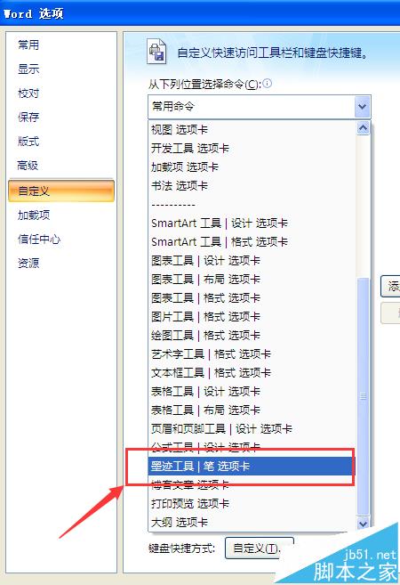 3、将"常用命令"选项改成"墨迹工具|笔 选项卡"