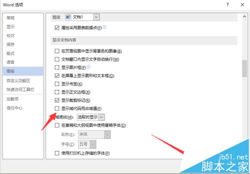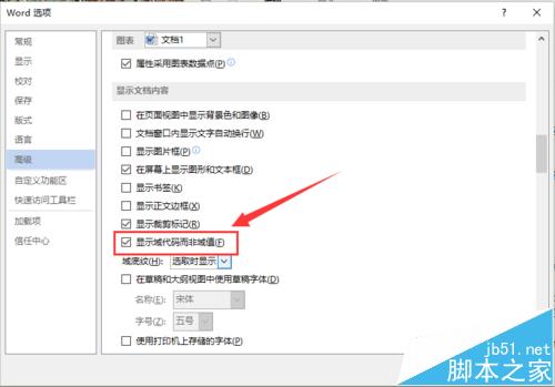 6、在"高级"功能选项的右侧窗格中,找到显示"显示文档内容"下的"显示域代码而非域值"并将其取消勾选。如图所示;