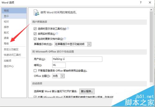 5、在打开的"Word选项"对话窗口中,点击左侧窗格中的"高级"功能选项。如图所示;