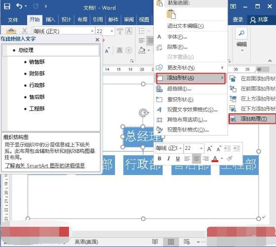 7、鼠标右键单击"总经理",弹出的快捷菜单中选择"添加图形",然后单击"添加助理"。