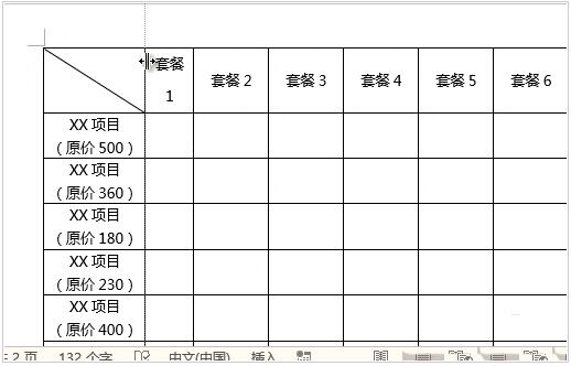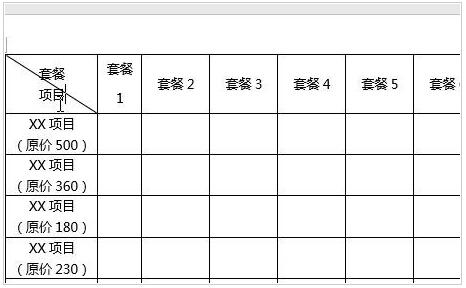 11、鼠标单击 表头斜线,输入:套餐后,按回车键,再输入:项目,如下所示: