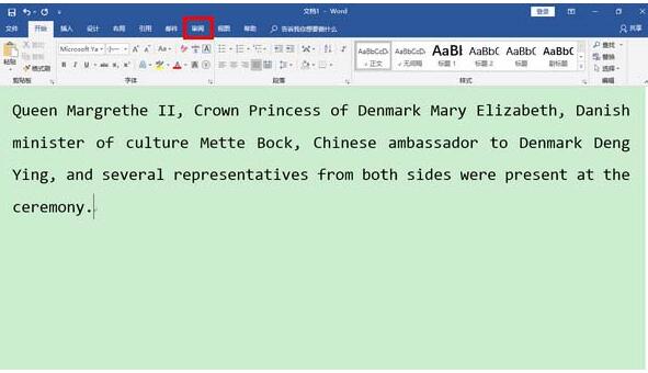 1、首先,在 Word 2019 中粘入要翻译的文本,再点击"审阅"菜单项。